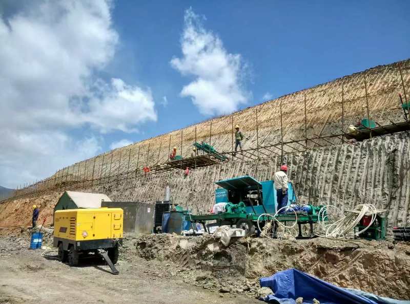 清除邊坡松動巖體,把邊坡坡面凹凸不平的地方大致整平;坡度越大,對錨桿、掛網要求越高,掛網的目的是讓種植基材在巖石表面形成一個持久的整體板塊,先在坡面上鋪鍍鋅鐵絲網或高強塑料加強網,網孔規格為5cm×5cm,然后用風鉆或電鉆按1×1m間距梅花形布置錨桿和錨釘。錨桿長90~100cm,錨釘長約50~60cm。應特別注意網與巖石之間的距離約為種植基材厚度的一半[1],然后在網上噴射兩層有機植生土。第一次噴射厚度約8~10cm作為基質(較薄處要求6cm以上),以覆蓋鍍鋅網為宜,側重于防護。第二次噴射混有草種及灌木種子的混合基質材料2~3cm,側重于植生;噴射后覆蓋無紡布以防雨水沖刷;局部凹緩坡面處可植喬、灌木;灌水養護一段時間后,從有機植生土中長出的草就覆蓋整個坡面,綠化見效又快又好。